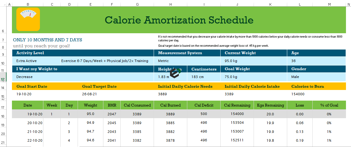 Download calorie amortization schedule in Microsoft Excel and Spreadsheet. This is a fitness and nutrition