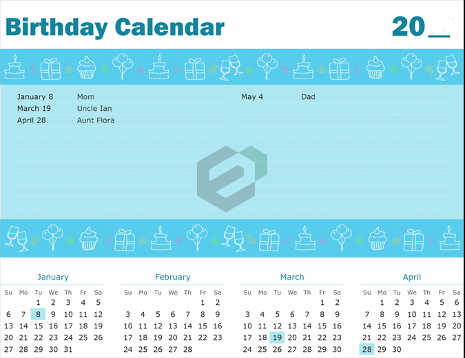 Never forget a birthday with this calendar template. Enter birthdays in the upper section and the calendar automatically highlights the dates.