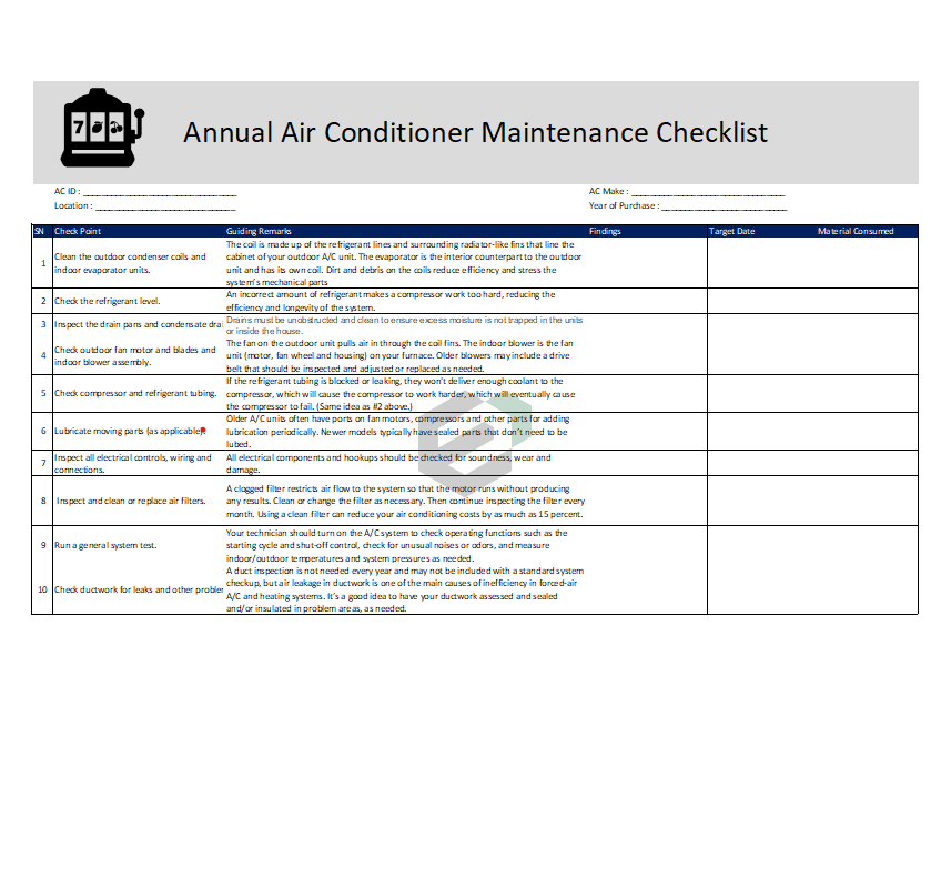 Free maintenance checklist comprehensive format for any engineering team who wants to look after the maintenance activity. Maintenance activity is vital for keeping the useful life of any machinery like Air Conditioner intact.