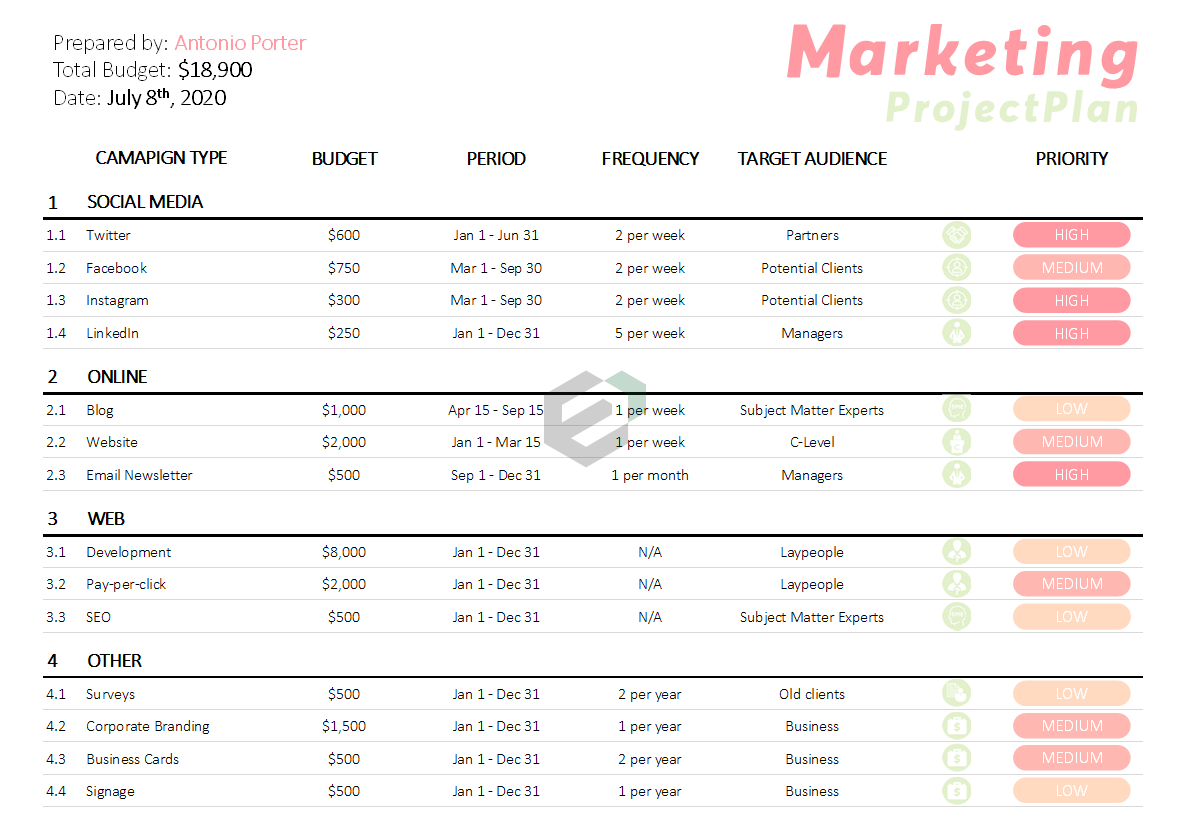 Are you looking for a sample marketing project planner ? If yes, this template can help you get started. This template has field to add campaigns, budget, frequency and target audience for your marketing projects. Explore and download now.